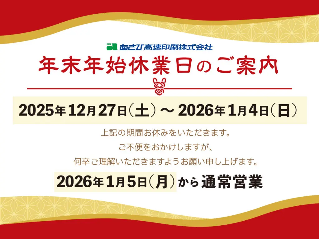 まことに勝手ながら、年末年始の休業につきましては下記の通りとさせていただきます。何かとご不便をおかけいたしますが、よろしくお願い申し上げます。